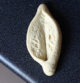 Roulez la pâte en un long boudin de 5 cm de diamètre, puis coupez-le en tranches de 1 cm d’épaisseur. Roulez chaque tranche en boudin, pincez les extrémités pour former des pointes, puis incisez le centre du gâteau pour obtenir la forme de la navette.