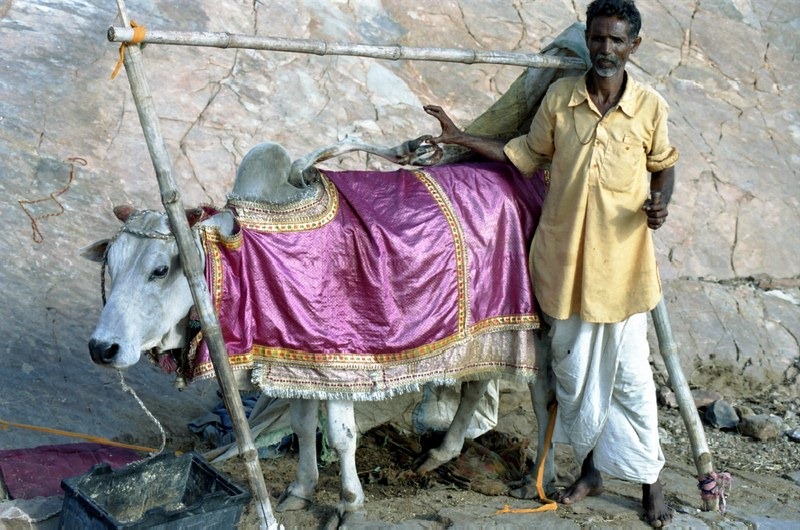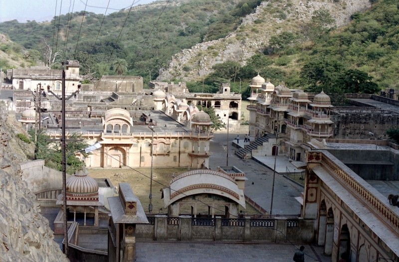 Les deux photos suivantes vous font découvrir le site de Galta, lieu de culte hindou autour de bassins sacrés. C’est sur le chemin du retour que nous avons croisé une vache sacrée “grâce” à une malformation !