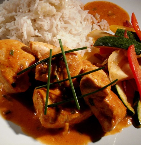 Ingrédients pour 6 personnes : 2 c. à s. de beurre clarifié – 2 oignons moyens émincés – 4 gousses d’ail pilées – 2 c. à c. de gingembre frais finement râpé – 1 poivron rouge moyen – 2 c. à c. de cumin moulu – 2 c. à c. de coriandre moulue – 2 c. à c. de paprika doux – 1 c. à c. de piment en poudre – 1 c. à s. de concentré de tomates – 425 g de tomates pelées en boîte – 6 blancs de poulet – 500 ml de bouillon de volaille – 60 ml de crème liquide – 1 c. à s. de concentré de tamarin (facultatif).