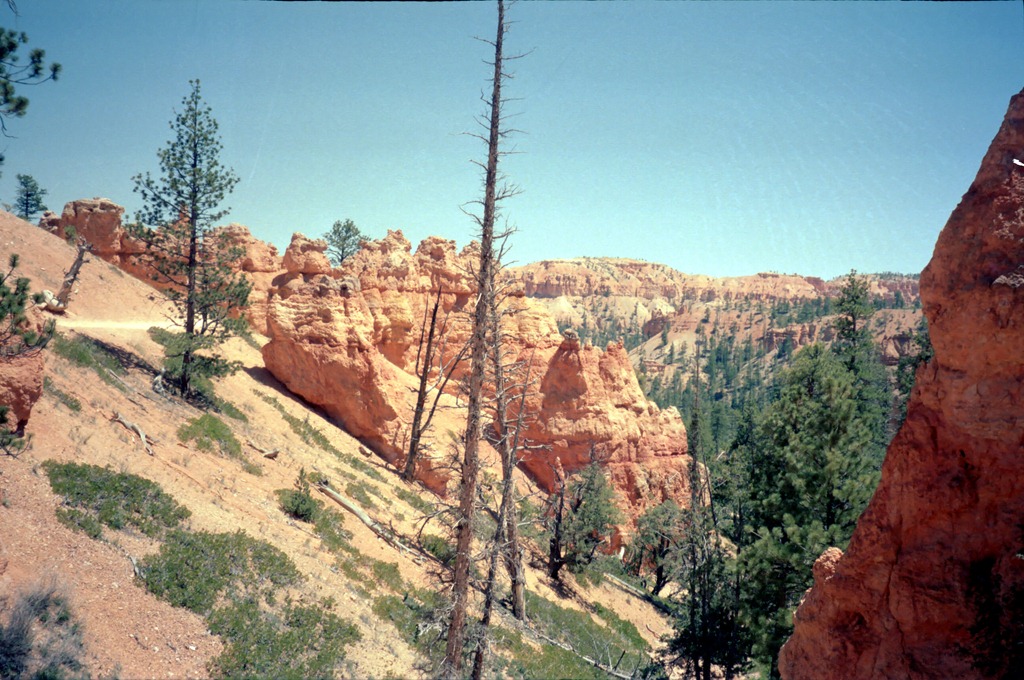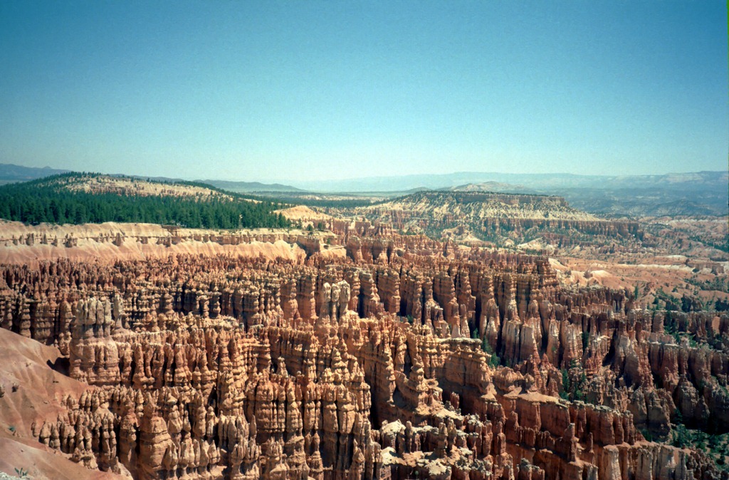 Nous voici donc avec notre dose de chlorophylle en route pour Bryce Canyon National Park. Ensembles rocheux étonnants de couleur rouge et orange, d’une trentaine de km de long situé au bord oriental du “pays des castor” à quelques 2500 m d’altitude.