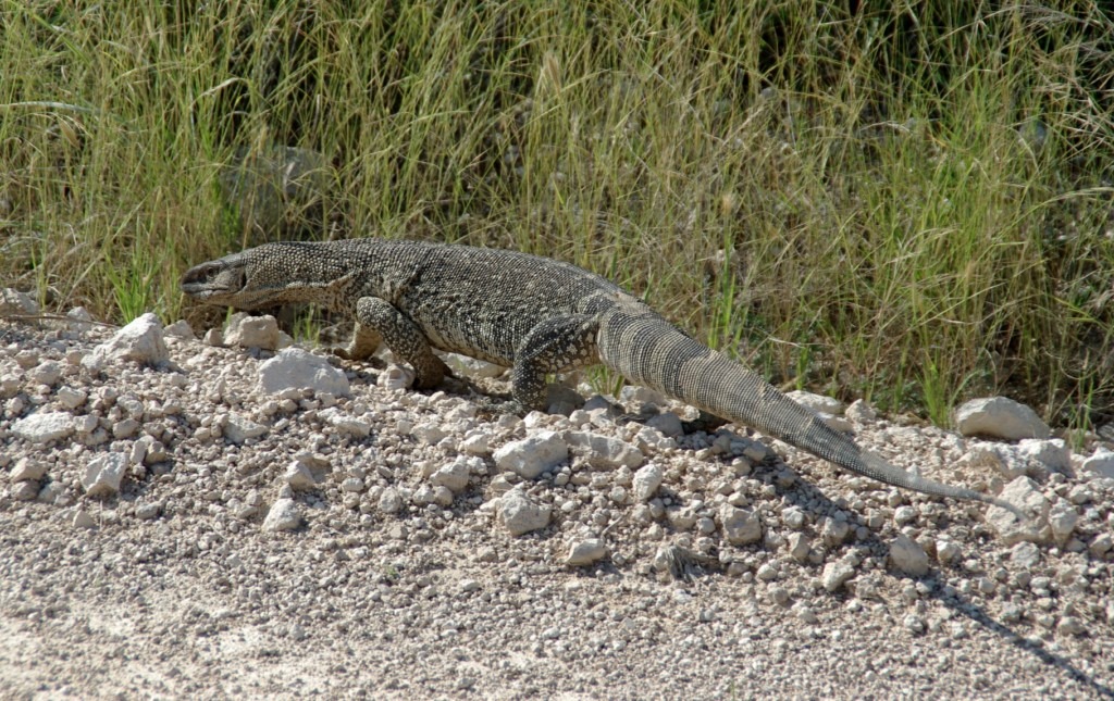 L’après-midi aura pour thématique, ils sont petits mais si mignons, avec quelques oiseaux aux couleurs multicolores, un caméléon en séance bronzage sur la piste sans oublier quelques troupeaux d’oryx, un charmant varan, avant de terminer avec un rapace…tout cela parmi les plaines d’Etosha et au loin le Pan.