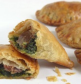 Abaissez la pâte feuilletée et découpez-la de façon à pouvoir faire des petits feuilletés, puis déposez au centre des fonds 1 cuillerée d’épinards et 1 morceau de chèvre.
