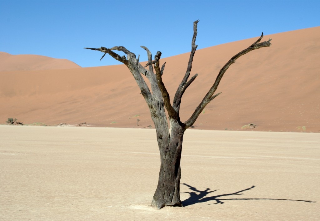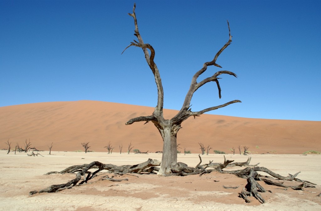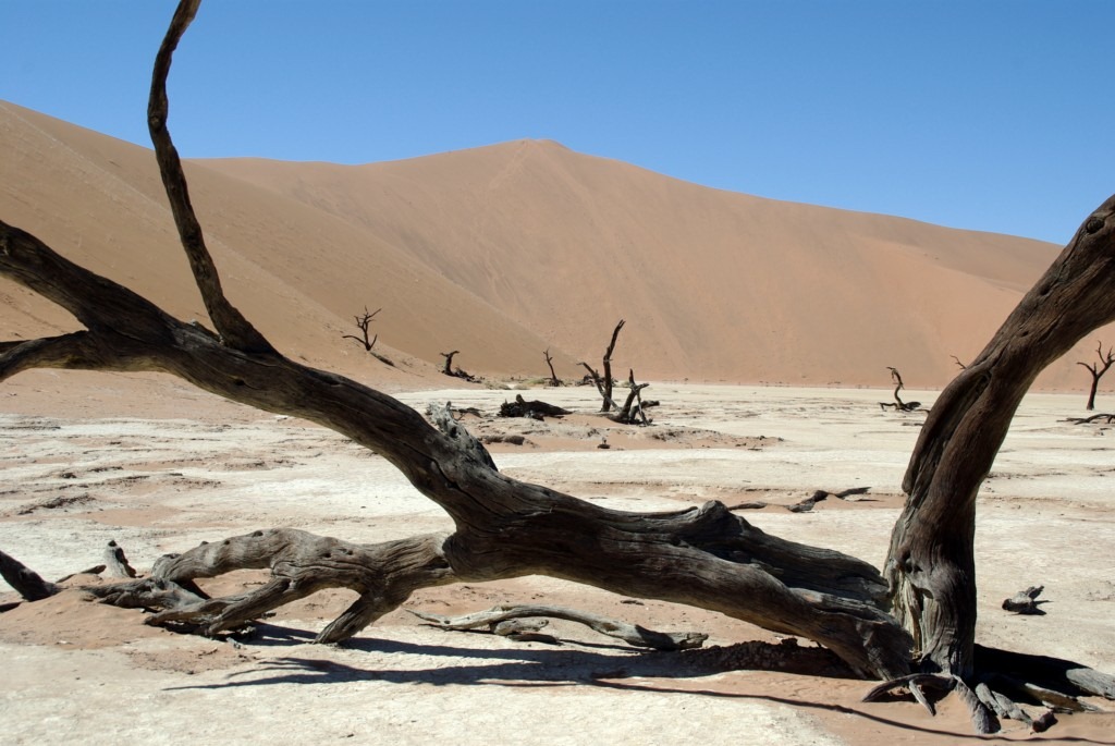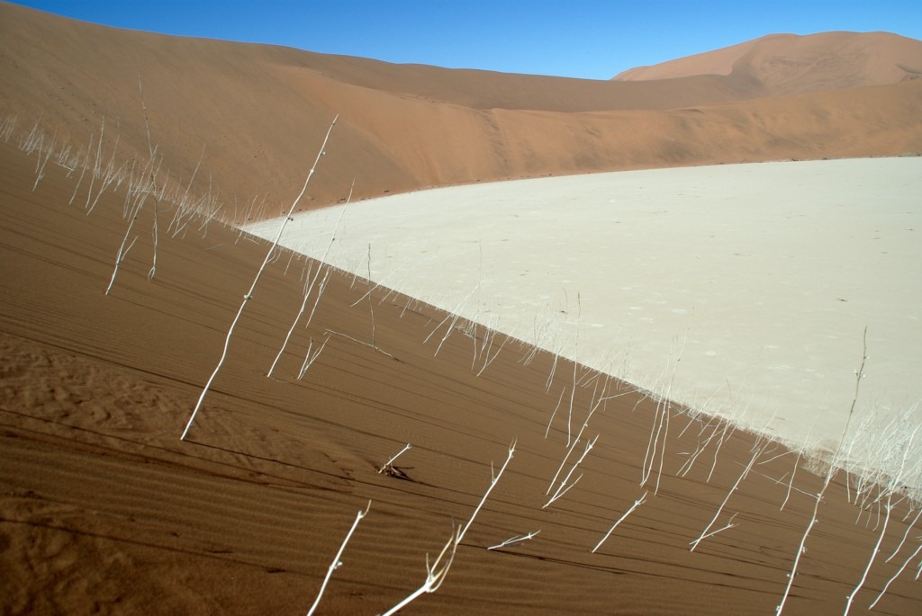 et de l’autre un lac asséché ou des arbres morts se détachent sur le bleu du ciel et l’orange du sable