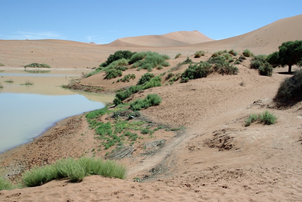 Nous progressons doucement sur l’arête de la dune de chaque côté un spectacle différent…d’un côté un petit lac qui s’est formé après la saison des pluies….