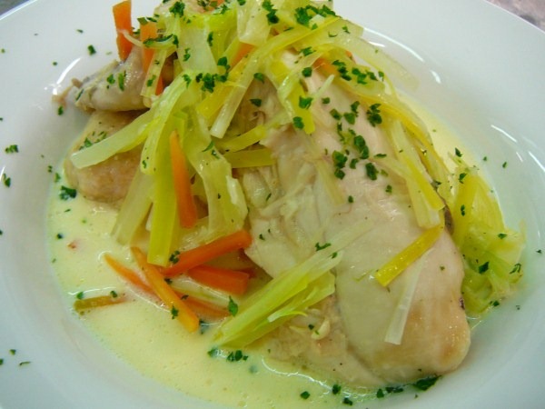 Ingrédients pour 6 personnes : 10 carottes – 3 poireaux – 500 h de branches de cèleri – 1 cèleri-rave – le jus de 2 citron – 1 bouquet de persil – 6 branche de menthe – 1 poulet fermier – 30 cl de crème fraiche – 3 jaunes d’œufs – Sel et poivre.