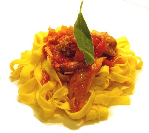 Ingrédients pour 4 personnes : 200 g de tagliatelles fraîches – 400 g de lapin en morceaux – 1 carotte – 1 branche de céleri – 1 petit oignon – 4 c. à s. de pecorino fraîchement râpé – 400 g de pulpe de tomates – 1 l de bouillon de légumes – 5 c. à s. d’huile d’olive extra vierge – Sel et poivre.