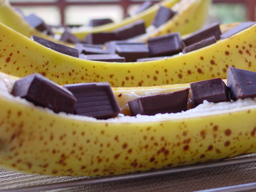 Ingrédients pour 6 personnes : 1 rouleau de pâte brisée – 4 bananes jaunes – 50 g de beurre + 1 noix pour le moule – 10 cl de lait de coco – 1 oeuf – 50 g de sucre roux – 3 cuil. à soupe de noix de coco râpée – 100 g de chocolat.