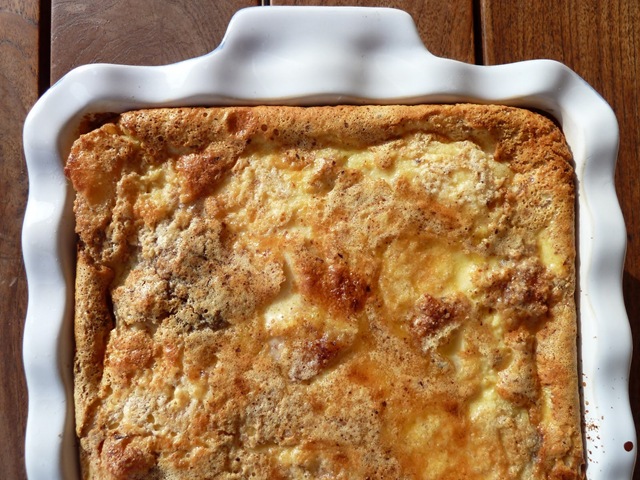 Enduisez un plat à gratin de beurre doux. Disposez-y les pommes sautées et poudrez-les de pralin. Versez le mélange aux œufs sur les pommes, ajoutez le reste de beurre salé en pettes parcelles et enfournez pour 30 min. Servez chaud ou tiède.