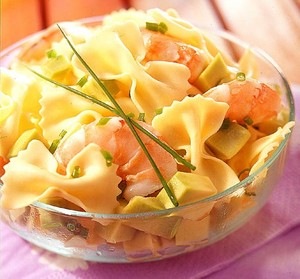 Ingrédient pour 4 personnes : 500 g de crevettes crues – 4 tomates olivettes – 1 bulbe de fenouil – 1 tête d’ail – 3 c. à s. de feuilles de basilic – 3 c. à s. d’huile d’olive – 200 g de farfalle sèches – sel – poivre noir du moulin.