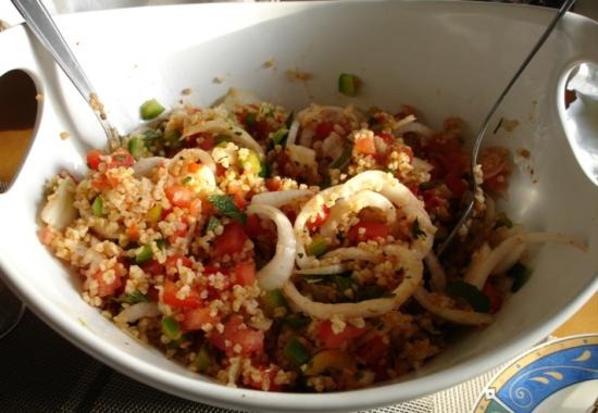 Ingrédient pour 6 personnes : 300 g de boulghour – 120 g de cerneaux de noix – 1 oignon rouge – 24 tomates cerises – 120 g de feta – 2 cuill. à soupe de menthe hachée – 1 cuill. à café de sel – 6 cuill. à soupe d’huile d’olive – 2 cuill. à soupe de jus de citron.