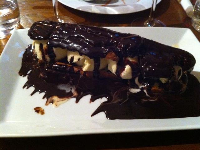 Pour la profiterole pas de publicité mensongère comme en témoigne la photo..mais surtout une pâte à choux parfaite (rare dans les restos aujourd’hui) et sauce chocolat maison qui se laisse “lécher” jusqu’à la dernière goutte…