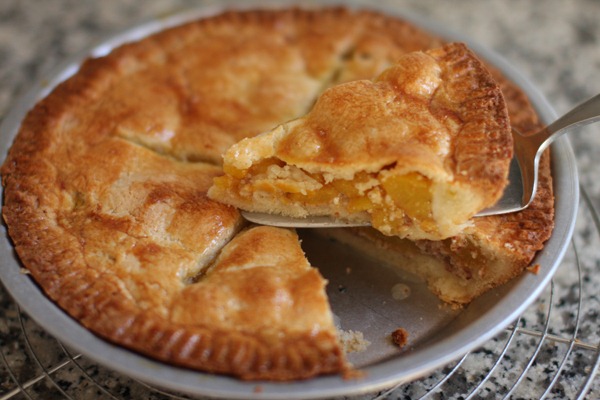 Ingrédients pour 6 personnes : 2 pâtes brisées – 2 cuill. à soupe de farine – 100 g de sucre en poudre – 2 cuill. à soupe d’amandes en poudre – 1 cuill. à café de cannelle en poudre – 1 kilo de pêche pelées, dénoyautées et coupées en morceaux – 1 cuill. à soupe de jus de citron – 10 g de beurre en cubes – 1 oeuf légèrement battu – Cassonade.