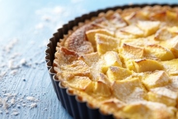 Ingrédients pour 6 personnes : Pâte brisée – 30 g de farine – 30 g de sucre – 1 cuillerée à soupe e Calvados – 4 pommes – 2 œufs – 20 cl de crème fraiche
