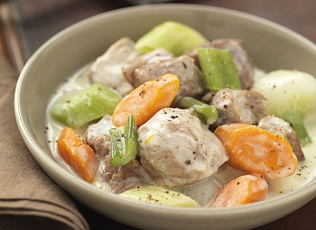 Ingrédients pour 6 personnes : 1,2 kg de sauté de veau coupé en gros morceaux – 4 carottes – 1 gousse d’ail – 1 cube de bouillon de volaille dilué dans 0,5 l d’eau – Quelques feuilles vert t tendre de 1 branche de céleri – 1 gousse de vanille – 150 g de crème fraîche épaisse – 1 cuillerée à soupe de jus de citron – Sel – poivre.