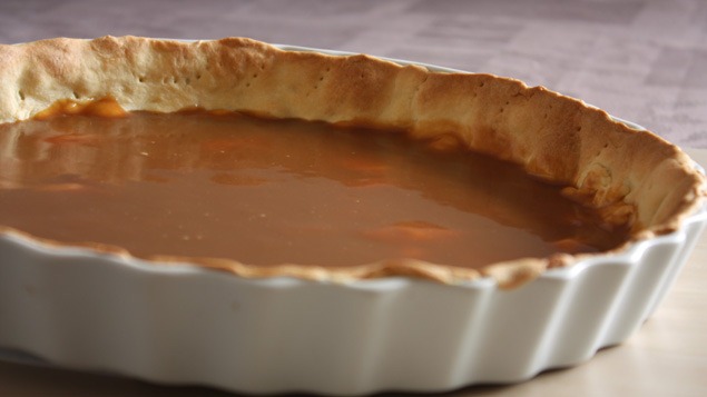 Préchauffez le four à 200 °C (th6/7) . Etalez la pâte brisée, puis garnissez un moule à tarte de 28 cm de diamètre. Versez le caramel laitier sur ce fond de tarte. Enfournez pour 45 min.