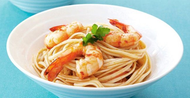 Ingrédients pour 4 personnes : 500 g de crevettes cuites – 500 g de linguine – 40 cl de crème fraîche – 250 g de ricotta – 1 gousse d’ail – 5 brins de persil – 1 oignon moyen.