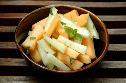 Ingrédients pour 4 personnes : 2 yaourts natures – 1 concombre – 6 brins de menthe – 1 citron – 1/2 c. à c. de sucre – 1 melon – 2 c. à s. de crème liquide – sel, poivre.