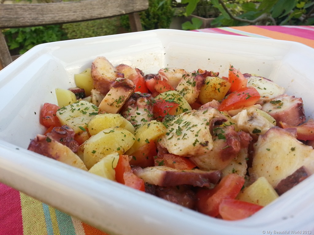 Mélangez-les avec le poulpe et assaisonnez d’huile d’olive, du jus de citron, sel, poivre et paprika.