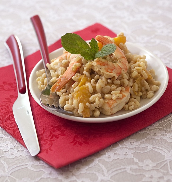 Ingrédients pour 4 personnes : 200 g de blé Ebly – 1 c. à c. de gingembre râpé -200 g de crevettes décortiquées 1 c. à s. de vinaigre de vin blanc -1 mangue  –  4 c. à s. de sauce soja – ½ botte d’oignons nouveaux – 3 c. à s . d’huile d’olive -2 gousses d’ail – 20 cl d’eau