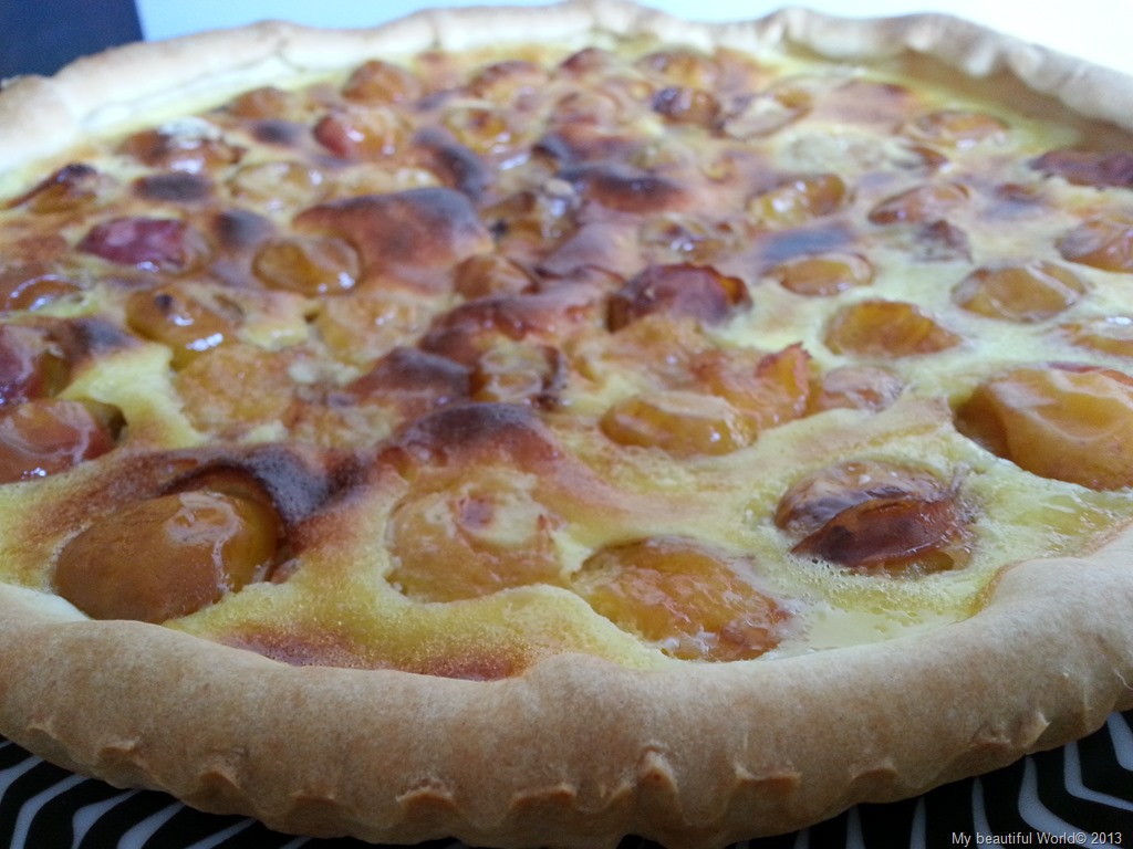 Enfournez tout de suite et laisser environ 30 minutes jusqu’à ce que la pâte soit dorée, la crème prise et les fruits légèrement caramélisés