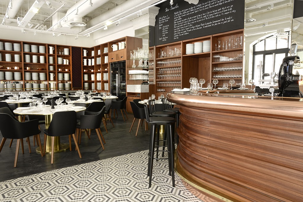 C’est autour d’un immense bar central que s’articule les différents espaces de LAZARE. La cuisine ouverte sur la salle (avec de chaque côté l’épicerie) le salon avec ses fauteuils club en cuir et les tables d’hôtes en bois sans oublier bien sûr la salle de restaurant. Le mélange bois, cuivre et cuir est très agréable.