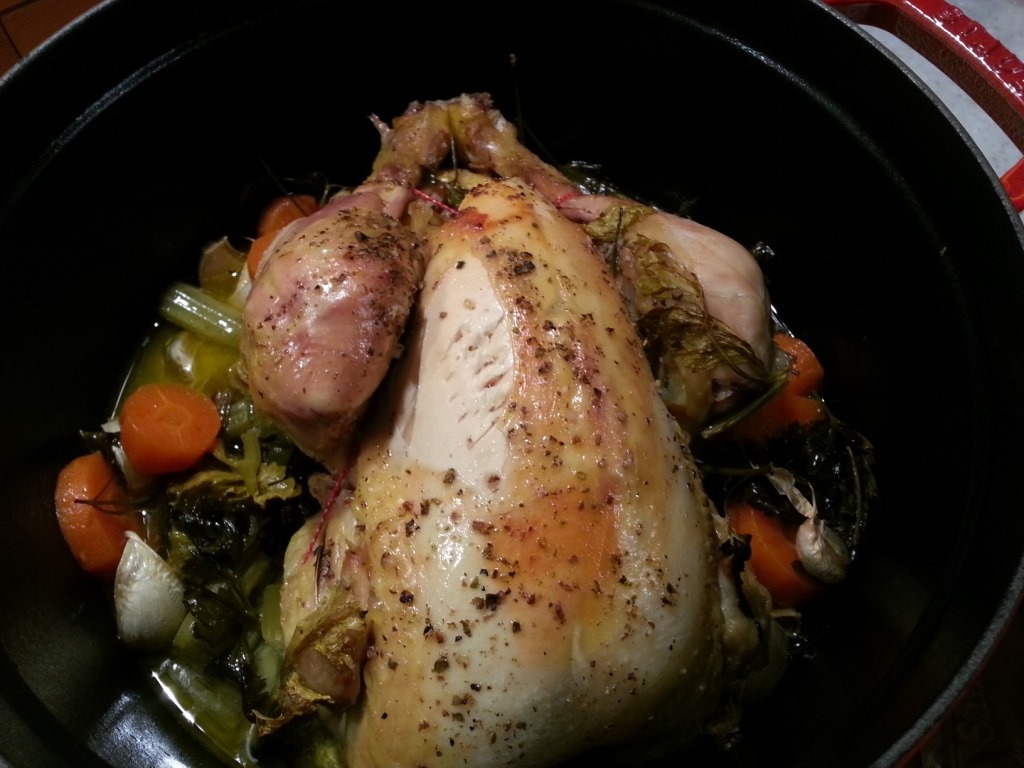 Donc en feuilletant ma petite centaine de livres de cuisine (oui j’en ai vendu pas mal depuis quelques années !!) j’ai découvert cette recette idéale pour cuire son poulet sans les inconvénients et surtout changer un peu du poulet rôti…Une recette qui parfume le poulet (Label rouge bien sûr !!).