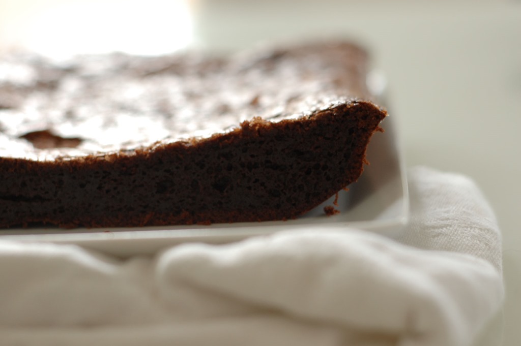 Ingrédients pour 8 personnes : 15 cl d’huile d’olive – 50 gr de poudre de cacao amer – 12,5 cl d’eau bouillante –2 c. à café d’extrait de vanille – 150 gr de poudre d’amandes – 1/2 c. à café de bicarbonate de soude – 1 pincée de sel – 150 g de sucre en poudre –3 œufs.