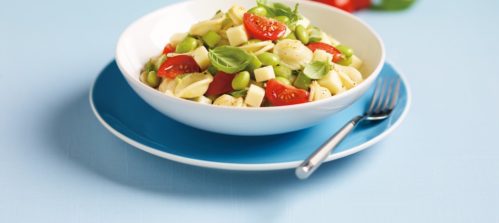 Ingrédients pour 4 personnes : 250 g de pâtes papillon – 2 tomates – 150 g de mozzarella – 12 feuilles de basilic – 12 olives noires – 1 citron – 6 c. à soupe d’huile d’olive – Sel, poivre.