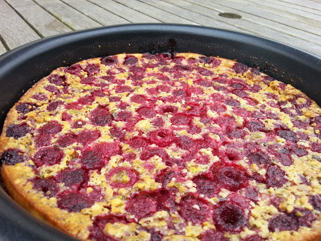Ingrédients pour 6 personnes : 300 g de framboises – 100 g de sucre – 50 g de beurre fondu – 20 cl de crème liquide – 10 cl de lait – 3 oeufs – 3 c. à soupe de pâte de pistache – 2 c. à soupe de farine – beurre pour le moule.
