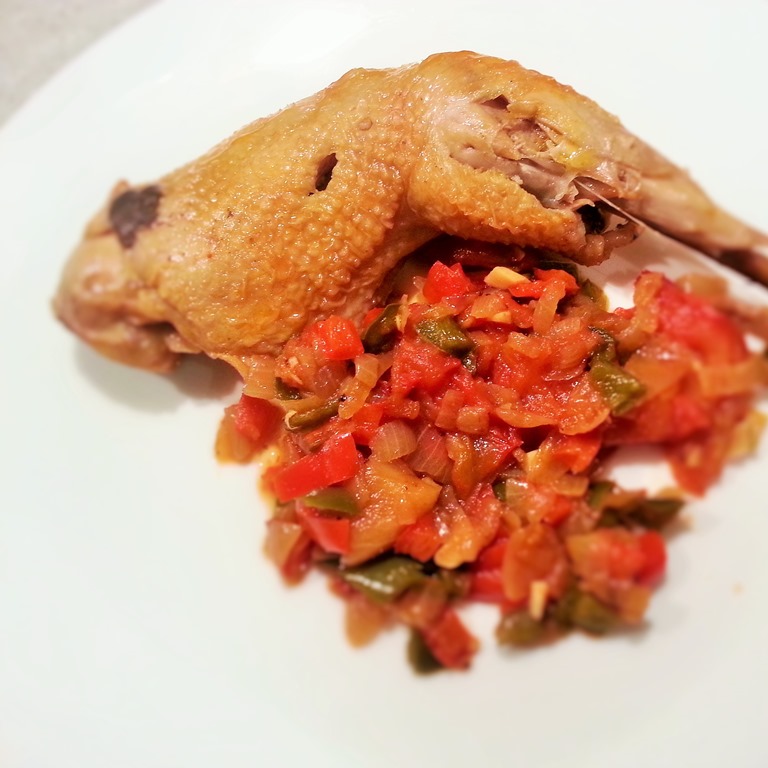 Ingrédients pour 4 personnes : 4 belles cuisses de poulet – 2 oignons – 3 gousses d’ail – 1 kg de tomates – 1 poivron rouge – 1 poivron vert –Sel –Poivre –  Piment d’Espelette – 3 c. à s. d’huile d’olive