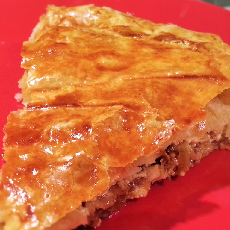 Ingrédients pour 6 personnes : 2 pâtes feuilletées – 2 blancs de poireaux – 2 échalotes – 3 champignons de Paris frais – restes de poulet – 4 tranches de jambon de pays – 10 cl d’eau – 1 oeuf et 1 jaune – 40 cl de crème fraîche – 1 c. à s. de curry