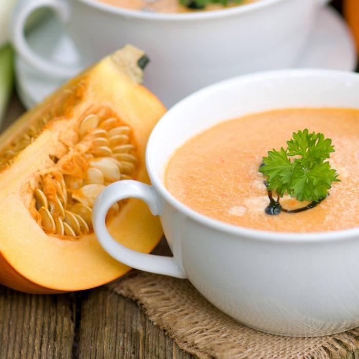 Ingrédients pour 4 personnes : 600 g de courgettes – 200 g de potiron – 2 pommes de terre – 1 gousse d’ail – 1 oignon – 1 cube de bouillon de boeuf – 25 cl de crème fraiche – eau – sel, poivre.