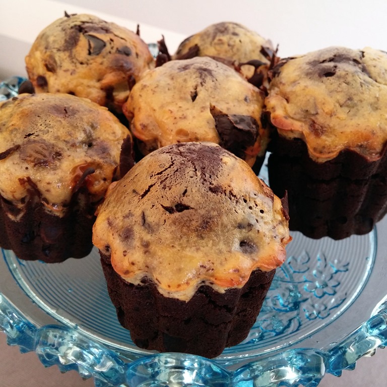 Ingrédients pour 16 cupcakes : 150 g de Philadelphia nature – 1 œuf battu – 10cl de lait – 50 g de sucre – 100 g de chocolat noir – 200 g de farine – 2 c. à café rases de levure chimique – 50 g d’amandes effilées – 125 g de sucre roux – 50 g de cacao en poudre non sucré – 10 cl d’huile de tournesol – 1 c. à soupe de vinaigre de cidre – 2 pincée de sel.
