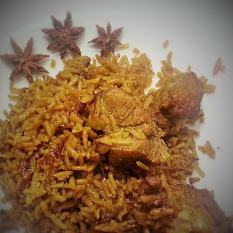Ingrédients pour 6 personnes : 800 g d’épaule d’agneau – 2 oignons – 20 g de gingembre frais – 150 g de beurre – 350 g de riz basmati – 1 c. à soupe de curcuma – 1 c. à soupe de cumin en poudre – 1 bâton de cannelle – 12 gousses de cardamome verte – 2 étoiles de badiane – 4 clous de girofle – 1 pincée de safran – sel.