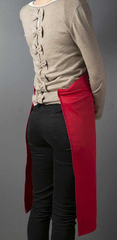 Ici le concept est simple (mais ingénieux !) A la hauteur de la ceinture, un anneau préformé logé dans une ganse est doté d’une élasticité qui fait prendre au tablier la forme de la taille. Plus besoin de cordons, le tablier s’adapte à toutes les corpulences.