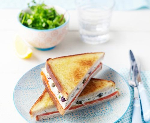 Ingrédients pour 4 personnes : 150 g de St Môret Ligne & Plaisir – 8 tranches de pain de mie – 4 tranches de truite fumée – 1/4 de bouquet d’aneth – 4 tranches fines d’emmental – 2 c. à c. de câpres – 8 olives noires dénoyautés – Poivre.