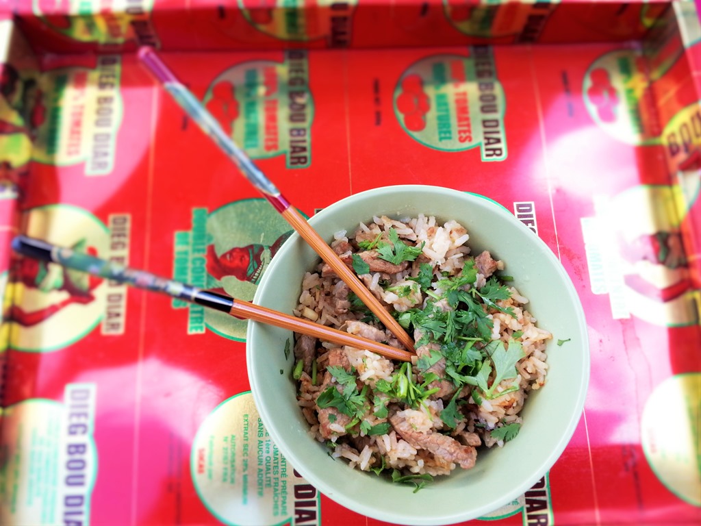 Ingrédients pour 4 personnes : 500 g de noix de veau – 3 tiges de citronnelle – 1 petite bouquet de coriandre – 4 tiges d’oignon nouveau – 4 cm de gingembre frais – 200 g de riz parfumé thaï – 2 c. à soupe de sauce soja – 1/2 c. à café de poudre de piment – 2 c. à soupe d’huile neutre.