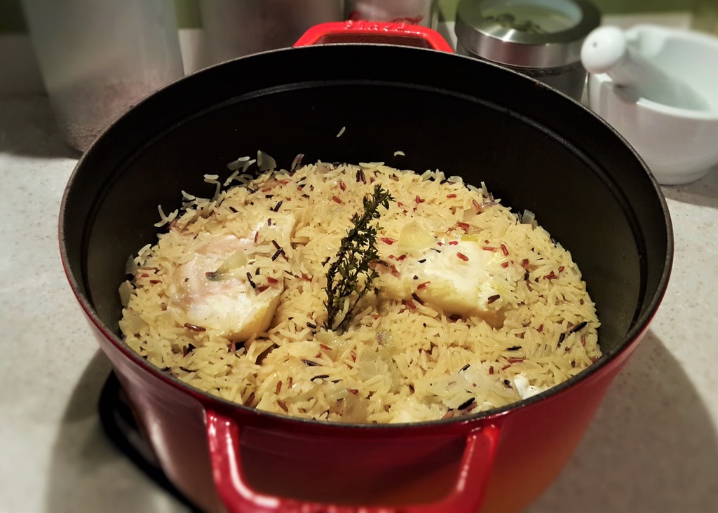 Ingrédients pour 4 personnes : 4 pavés de cabillaud – 250 g de trio de riz (rouge, long et sauvage) – 1 oignon – 2 gousses d’ail – 1 c. à s. de fumet de poisson – 2 c. à s. d’huile d’olive – 1 branche de thym – Sel et poivre.