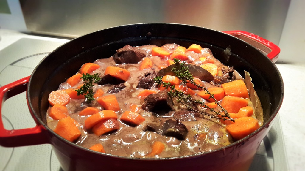 Quand la viande est bien colorée, saupoudrez de farine, mélangez et laissez cuire encore 2 minutes. Ajoutez ensuite les oignons, les carottes, le thym, la laurier et le sel. Mouillez avec le vin et le bouillon de bœuf. Portez à ébullition, couvrez et laissez mijotez tout doucement à couvert pendant 2 heures minimum en mélangeant de temps en temps.