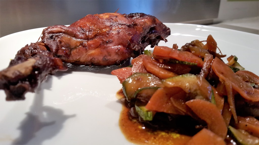 Ingrédients pour 4 personnes :  4 cuisses de lapin – 3 carottes – 2 petites courgettes – 1 oignon – 1 citron – 6 c. à soupe de sauce soja – 4 c. à soupe d’huile d’olive – 1 c. à soupe de sucre roux.