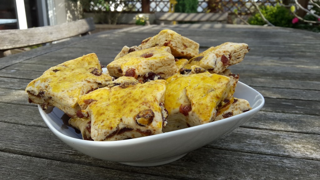 Ingrédients pour 6 personnes : 25 cl de lait – 90 g de beurre – 1 jaune d’oeuf – 500 g de farine – 150 g de raisins secs – 4 g de bicarbonate de sodium – 2 c. à soupe de sucre – Sel.