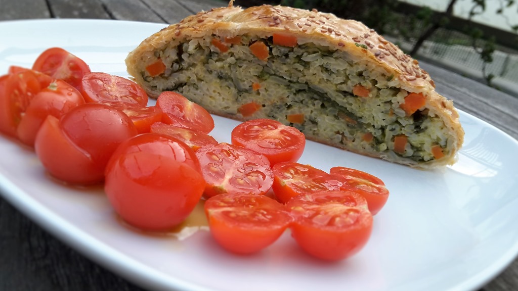 Ingrédients pour 6 personnes : 1 pâte feuilletée rectangulaire – 125 g d’épinards – 2 carottes- 1 gousse d’ail – 1 oignon – 1 bouquet de persil – 1 œuf + 1 jaune – 125 g de comté râpé – 50 g de beurre demi-sel – 200 g de riz long – 1 c. à soupe de graines de sésame – Sel, poivre.