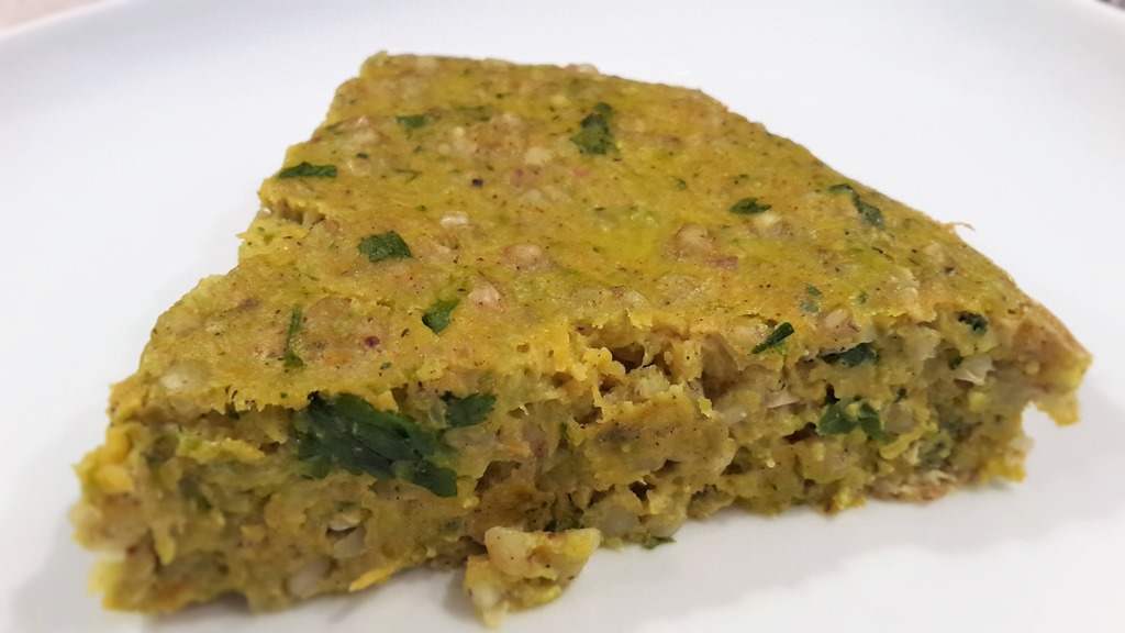 Ingrédients pour 6 personnes : 3 carottes – 2 courgettes – 1 oignon – 3 œufs – 10 brins de persil plat – 5 brins de coriandre – 80 g de graines de sarrasin – 40 g de farine de sarrasin – 20 cl de lait – 3 pincées de curry – 1 c. à soupe d’huile d’olive.