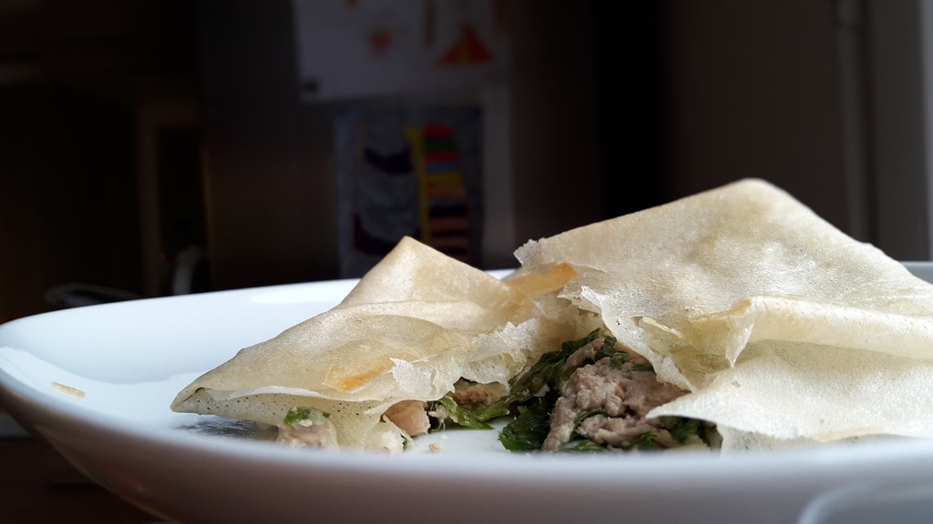 Ingrédients pour 4 personnes : 8 feuilles de brick – 250 g de thon en boite nature – 200 g de féta – 2 poignées de jeunes feuilles d’épinards – Huile d’olive – Quelques gouttes de jus de citron – Sel , Poivre.