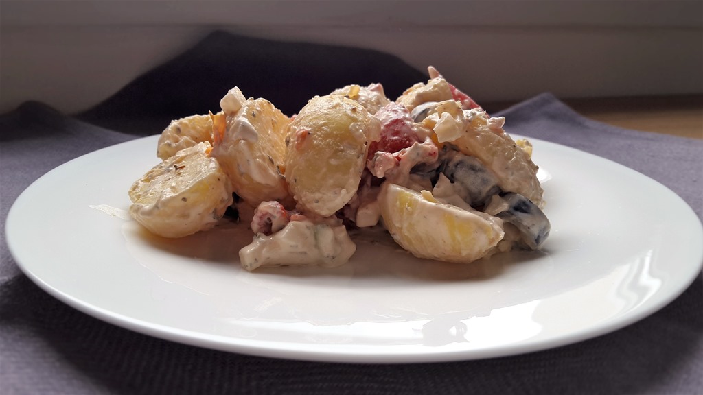 Aujourd’hui c’est corvée de patates mais pour la bonne cause, ce qui rend cette salade originale c’est la sauce crémeuse à souhait et qui adoucit l’acidité de la tomate et des oignons, cette salade est parfaite pour un pique-nique ou pour emporter sur la route des vacances loin des aires d’autoroutes…