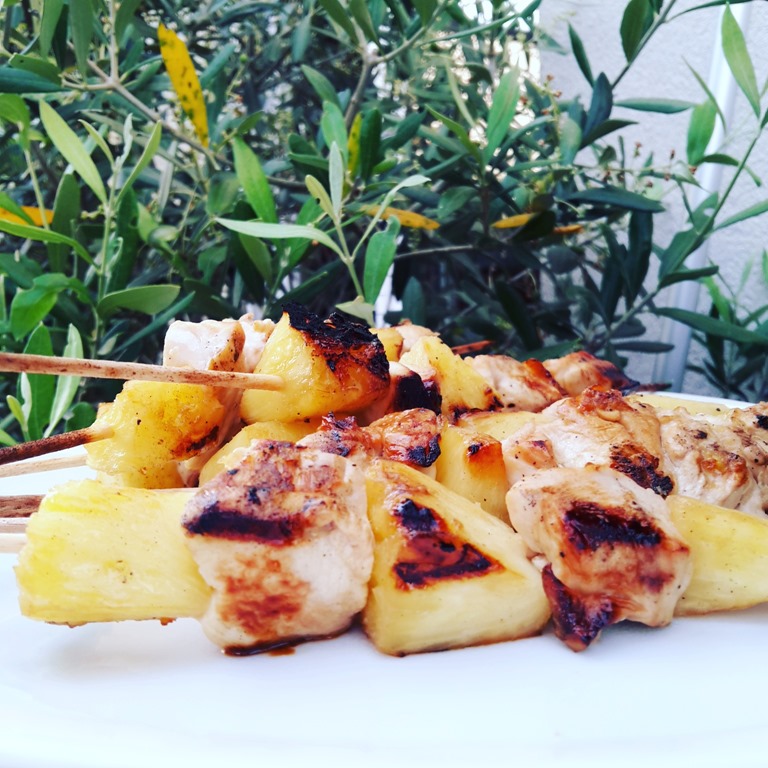 Ingrédients pour 4 personnes : 4 blancs de poulet – 10 tiges de citronnelle – 2 cm de gingembre – 1 ananas Victoria – 2 cuil. à soupe de sauce soja – 1 cuil. à soupe d’huile de sésame – 2 citrons verts.