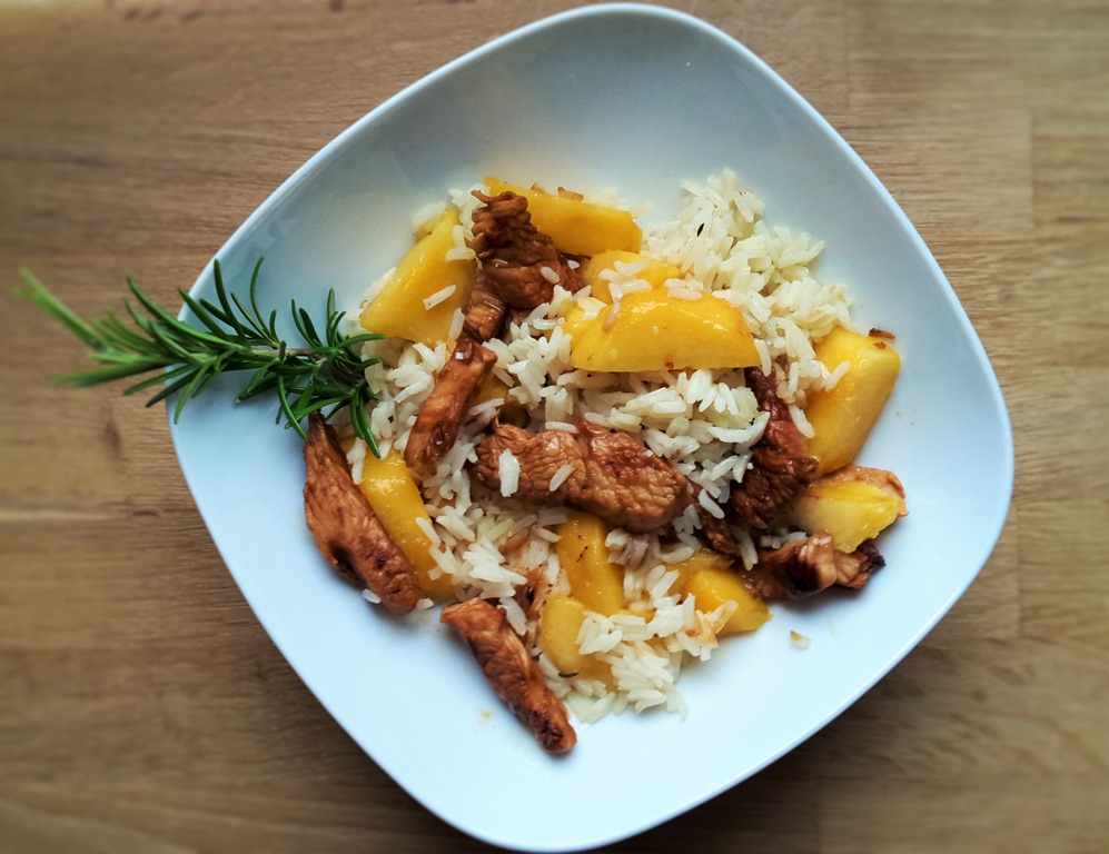 Ingrédients pour 4 personnes : 4 escalopes de dinde – 240 g de riz thaï – 2 pêches – Sel, poivre – 1 citron – Quelques branches de romarin – 2 grosses c. à soupe de miel.