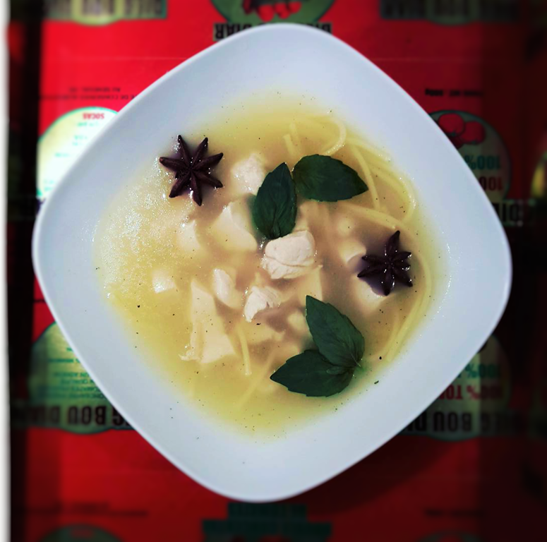 Ingrédients pour 4 personnes : 2 blancs de poulet – 150 g de spaghettis – 6 anis étoilés – 2 tiges de citronnelle – 3 tablettes de bouillon de volaille – 1 bottes de basilic asiatique.