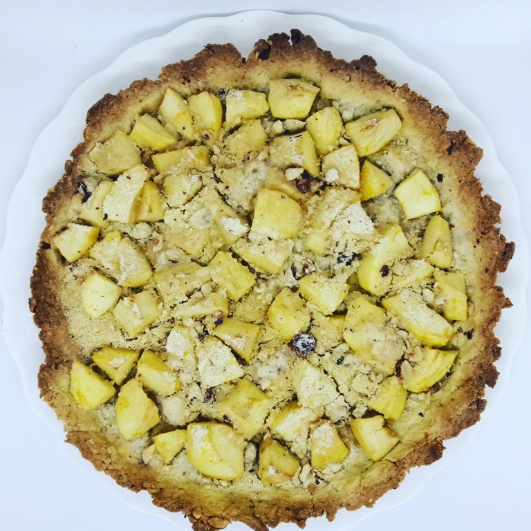 Ingrédients pour 8 personnes : 3 pommes – 1 citron bio – 200 g de beurre – 3 jaunes d’oeufs – 350 g de farine – 125 g de noisettes grillées – 120 g de sucre en poudre – 2 c. à soupe de cassonade – Sel.