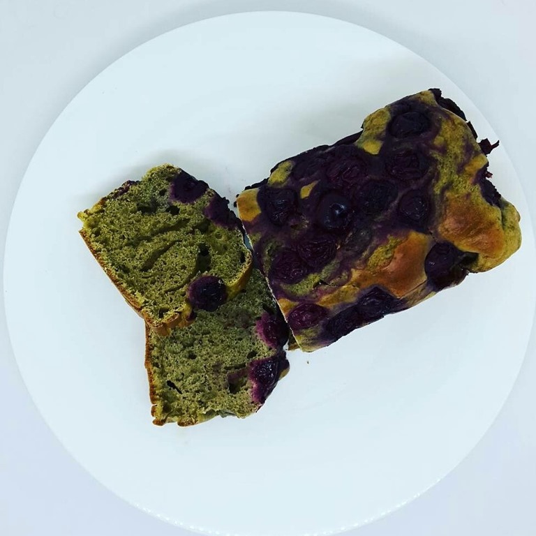 Ingrédients pour 8 personnes : 150 g de griottes – 3 œufs – 150 g de fromage blanc – 200 g de farine – 3 c. à soupe de sucre semoule – 1 c. à soupe d’huile de tournesol – 2 c. à café de thé matcha en poudre – 1 sachet de levure chimique.